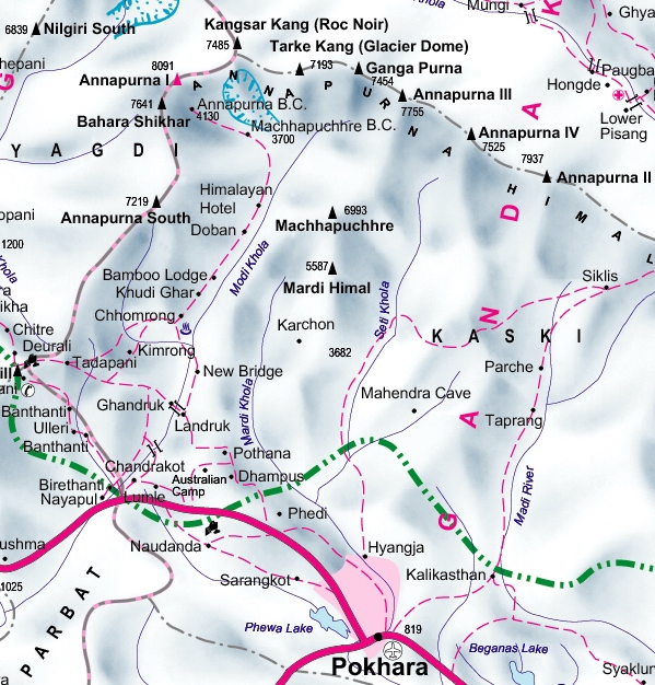 From Pokhara we will take a bus to Phedi which appropriately enough means “foot” in Nepali. From Phedi I don’t think there is any road at all and so obviously no cars, motorbikes and so on! The trail leads from Phedi to Dhampus, Pothana, Landruk, New Bridge to Chhomrong. This part of the trek passes over the top of one valley down into the next and then up the other side. It is therefore pretty physically demanding and while the rest of the hike is at a higher altitude, the gradients are not as severe. These first couple of days are going to be a bit of an ordeal for Julian and I and I’m not intending for us to charge on heroically. I hope our porter brings a good book with him because he’s going to spending quite a long time hanging around waiting for us to catch up.
