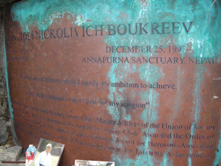 The memorial plaque for Anatoli Boukreev who died climbing Annapurna 1 on Christmas Day 1997.