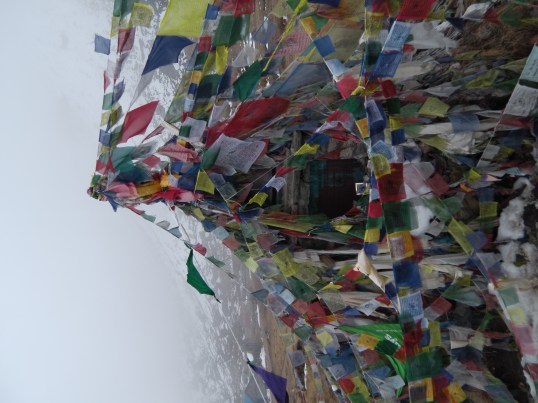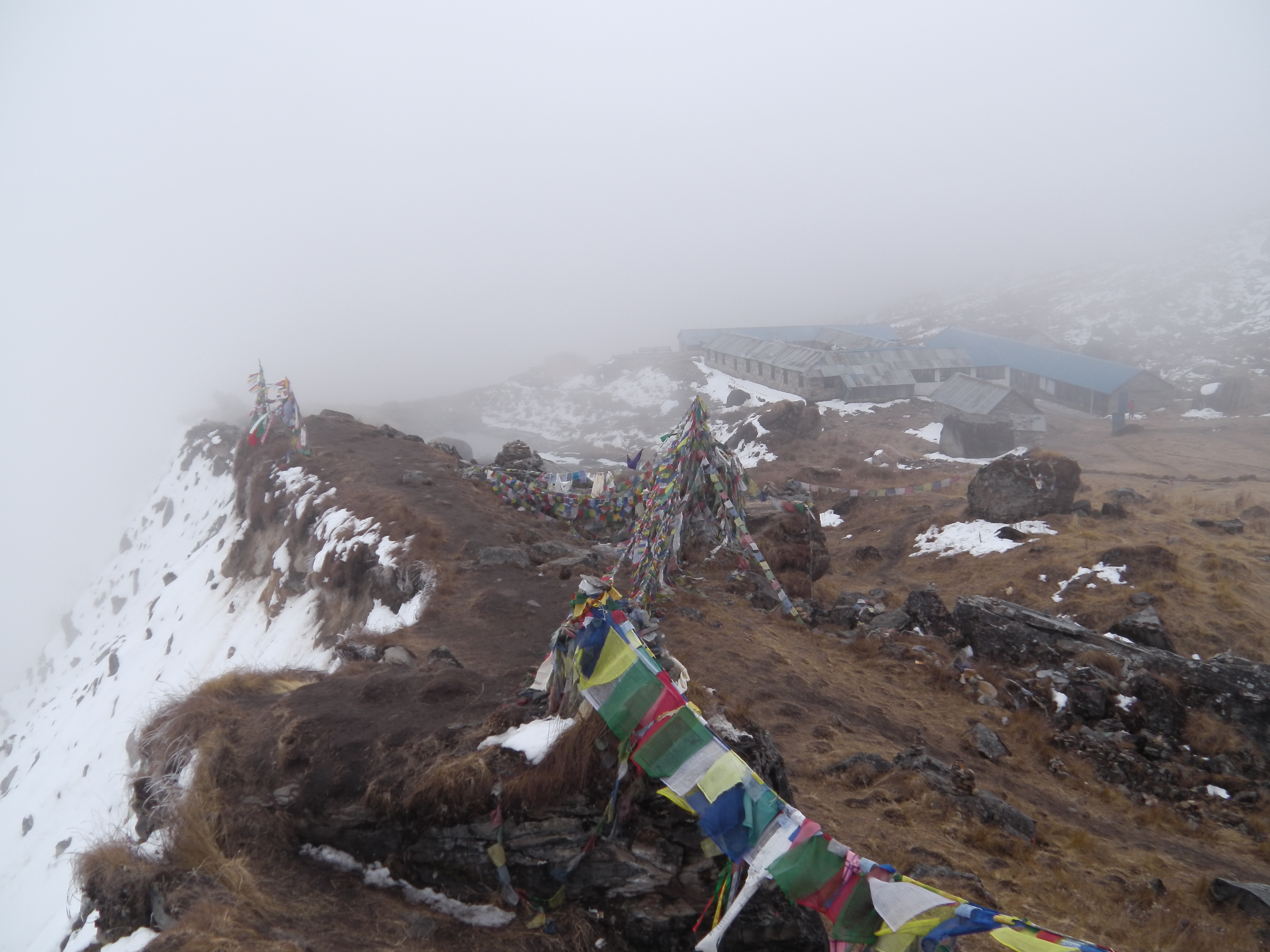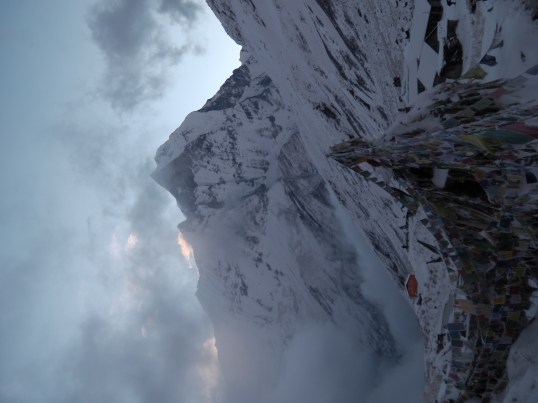 Prayer flags and cairns at ABC with the four lodges in the background.