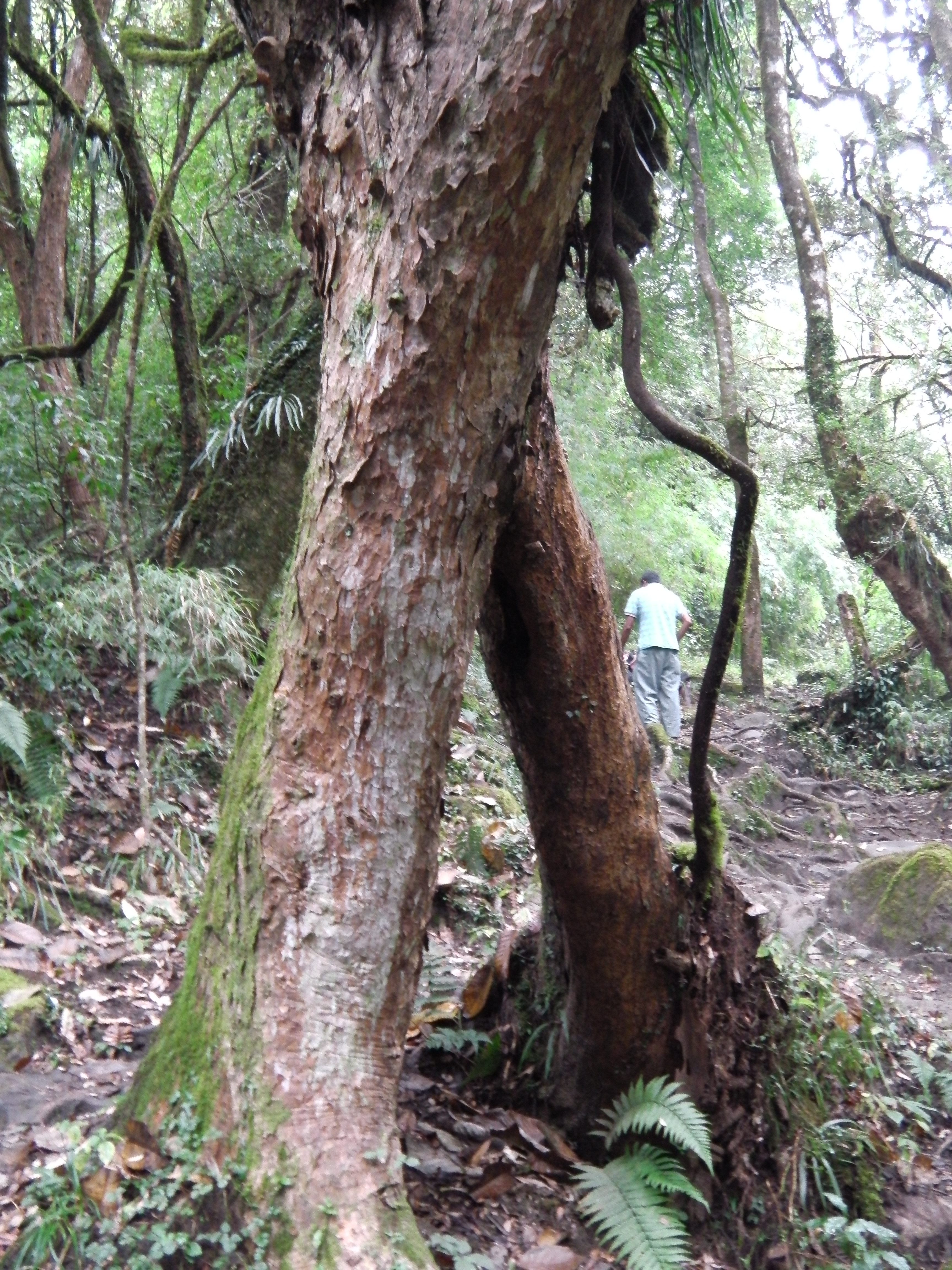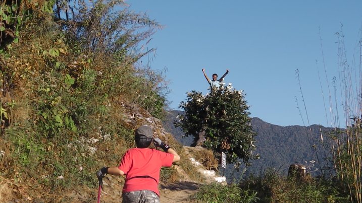 Our ever cheerful porter, Narayan, waits in a tree for is to catch him up.